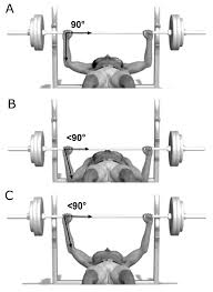 Vertical forearms at the bottom. Flexing the elbows to lower the bar. The wide grip is the most movement efficient bench press grip to use in terms of bar path meaning it requires the least amount of bar movement to complete a rep.