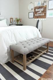 Songmics folding storage ottoman bench foot rest stool storage chest with wooden divider holds up to 660 lb dark grey ulsf77k. For a bench that s just right the length should stretch across most of your bed leaving a few inches of space on either side. 4 6 out of 5 stars 1 918.