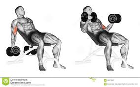 Set an incline bench to an inline of your liking generally 45 60 degrees. Lie back on an incline bench. Lie backward onto the bench while concurrently moving the dumbbells from your knees to a supported position at your sides and then press them up until your arms are nearly extended.