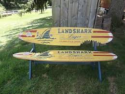 Up for auction is a landshark lager beer jimmy buffet 2 surfboard bench. Only 2 left favorite. 71 wide 25 tall 27 deep.