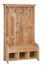 Many foyers and front halls don t have a closet so the next best option is a hall tree for a place to hang coats hats and a place to sit down if you opt for a model with a bench. From finished to unfinished wooden storage benches coat trees and hall trees to storage chests we offer many selections from the top solid wood furniture manufacturers. Misson hall tree with storage bench walnut linon.